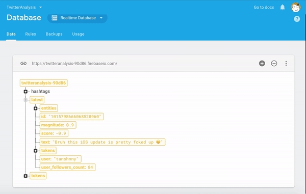 This is how FireBase real-time dashboard looked like when processing real-time tweets data of Apple products which has already been analyzed by Google Natural language API. You can see magnitude, score, text, tokens associated with every tweet here.