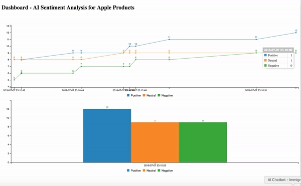 I used Eon open source project to build a simple dashboard that subscribes to the queue I created in the Eon Messaging system. The dashboard shows real-time changes in total counts of positive, neutral, and negative sentiments for Apple products. Here is the final Dashboard!! You can check this video to see real-time dashboard changes. You can check out the project from my GitHub repo here