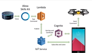 I wasn't sure how feasible the idea was. I did a lot of research and dived into all the technical details to see if this was even possible. At first, I couldn’t find any information regarding the voice flying system. To my surprise, eventually, I found something similar on hacker.io. There is one open-source project which used AWS IOT service and a programmable drone to control the drone through a mobile App which built on drone SDK. I knew I found gold! All I need was to first make sure this open-source project really works and second prove the whole project will work with the Alexa skills I was about to build.